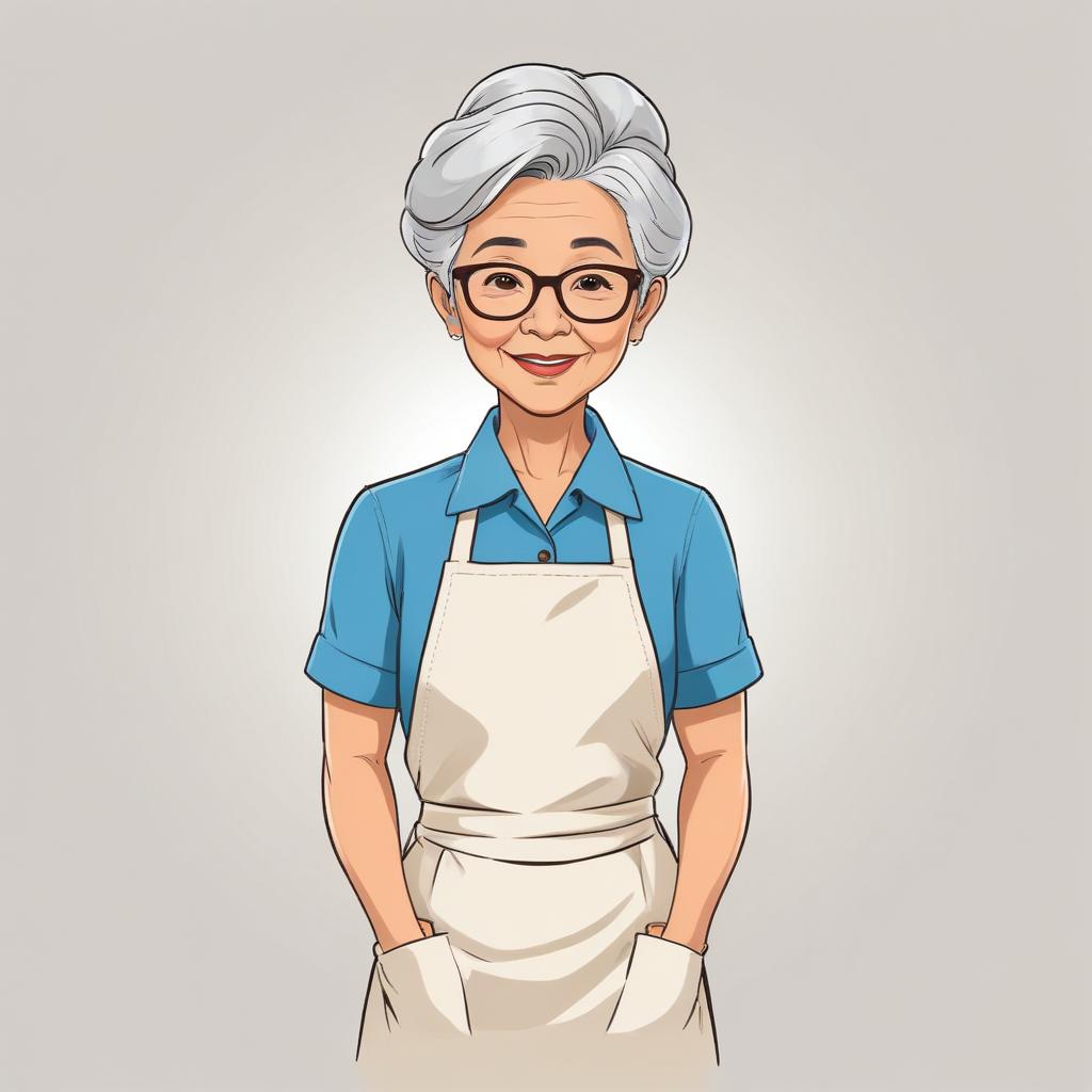 An elderly woman stands confidently with a smile, wearing a blue shirt and apron. She looks warm and welcoming, ready for cooking.