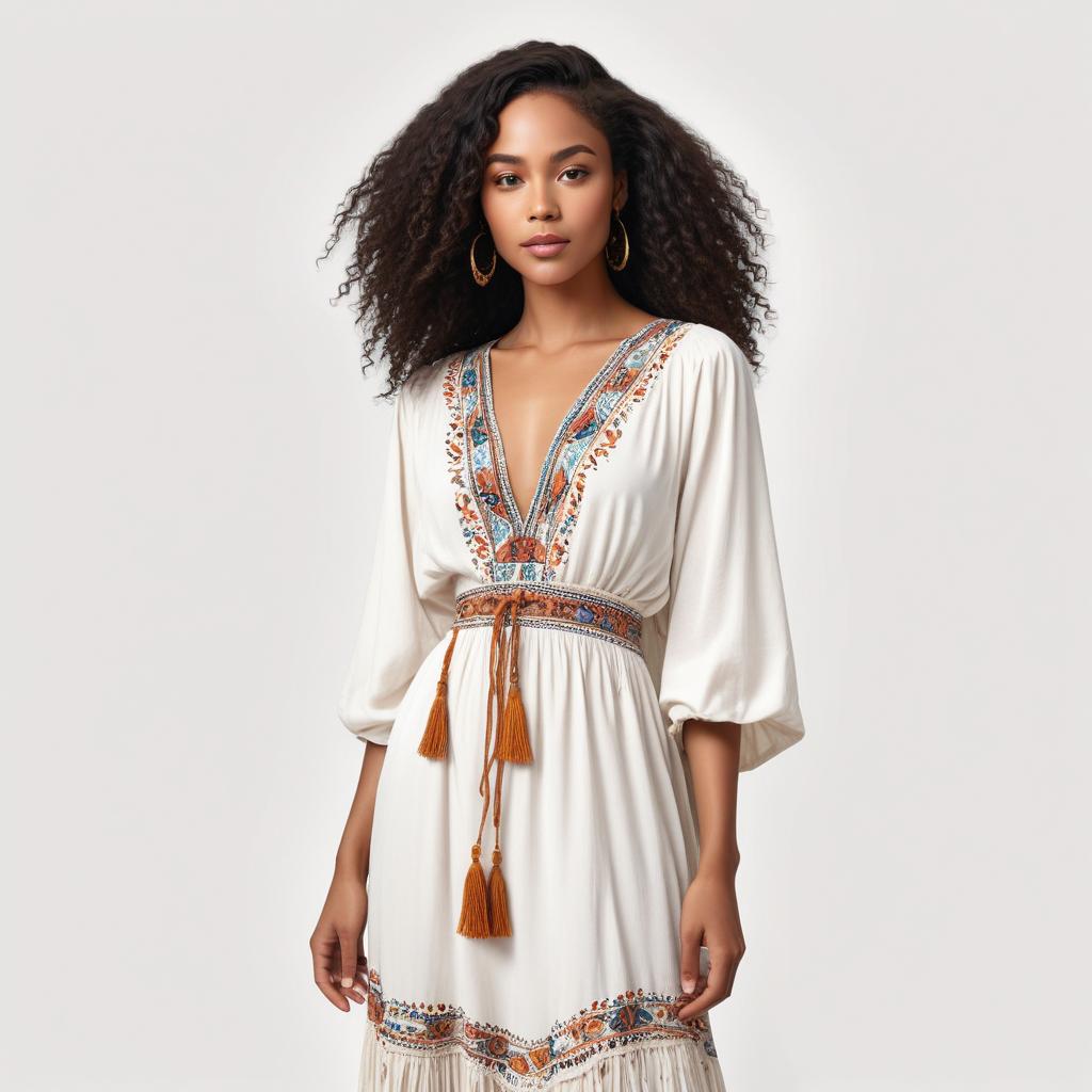 accessories, background, beauty, bohemian, casual wear, confidence, contemporary, curly hair, dress, elegance, fashion, flowy, intricate design, model, portrait, posing, style, tasseled, trending, white