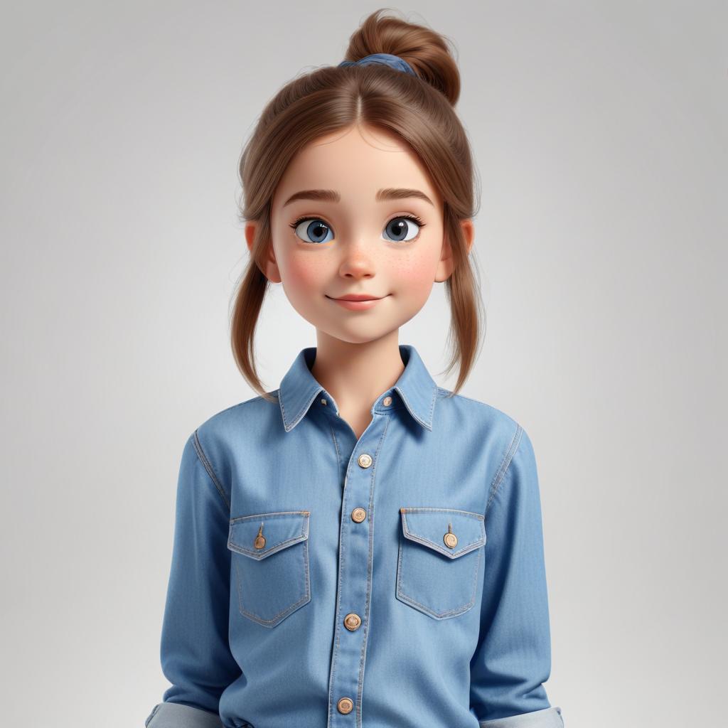 A young girl with brown hair in a ponytail smiles warmly while wearing a blue denim shirt. She has bright eyes and a friendly expression.
