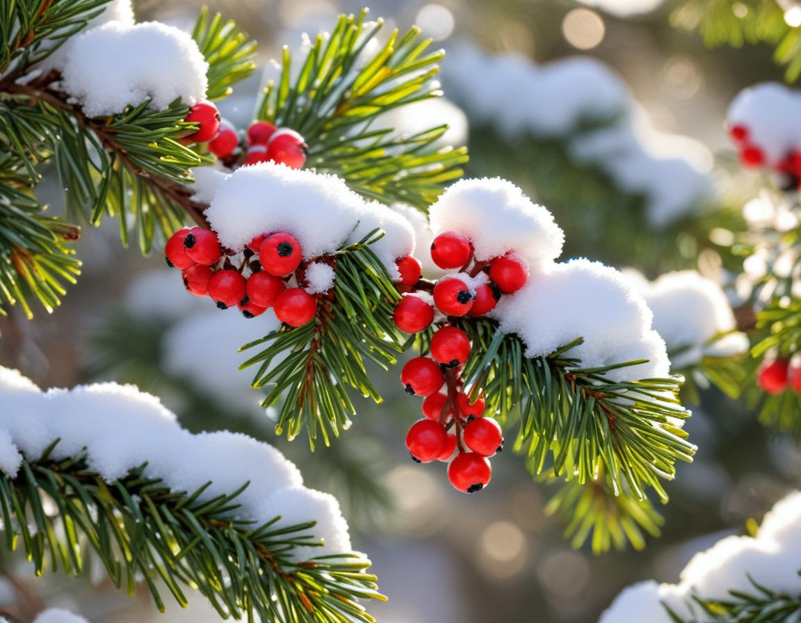Red berries contrast beautifully with green pine needles and white snow, creating a serene winter scene in a forested area.