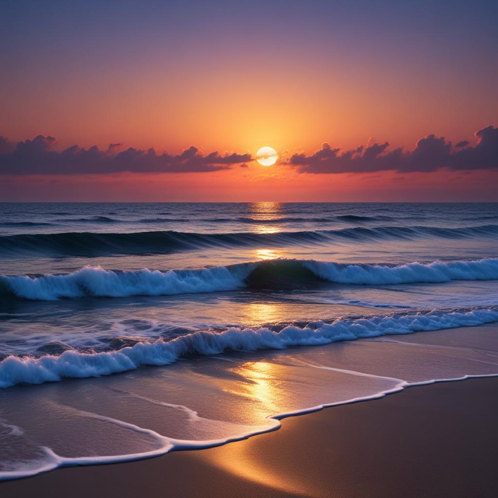 Bright orange sun sets over the ocean, casting shadows on gentle waves and wet sand. The sky transitions to purple and blue hues.