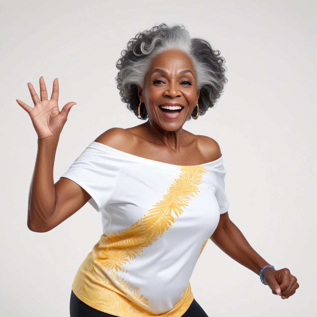 An older woman with gray hair smiles brightly while waving her hand. She wears a stylish white and yellow top and enjoys a moment of happiness.