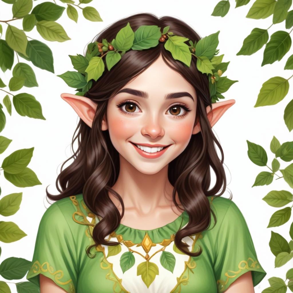 A young elf girl smiles warmly, adorned with a leafy crown, surrounded by vibrant green leaves, evoking a whimsical, enchanting atmosphere.