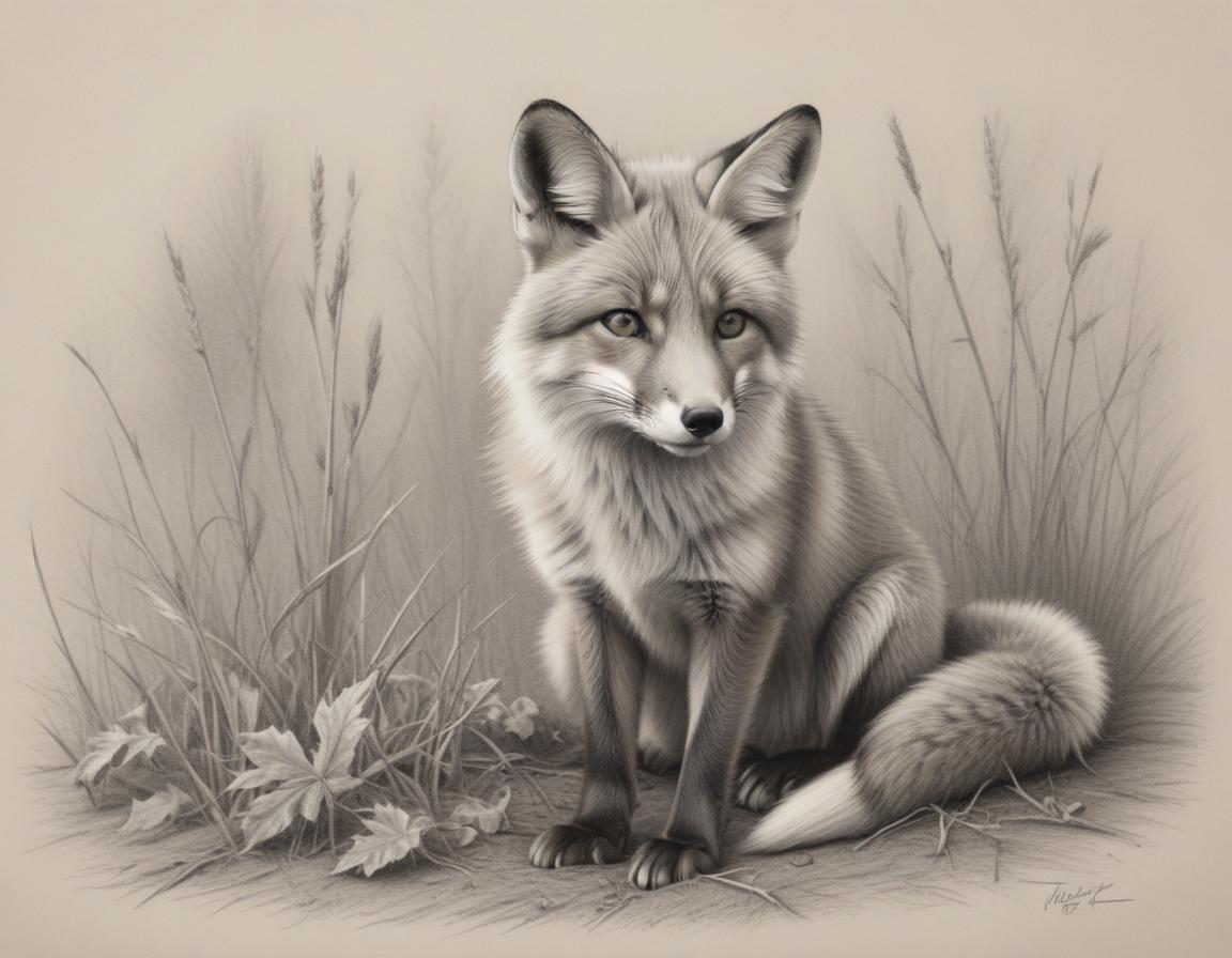 A detailed illustration of a seated fox amidst grass and leaves, showcasing its fur texture and bright eyes in a natural scenery.