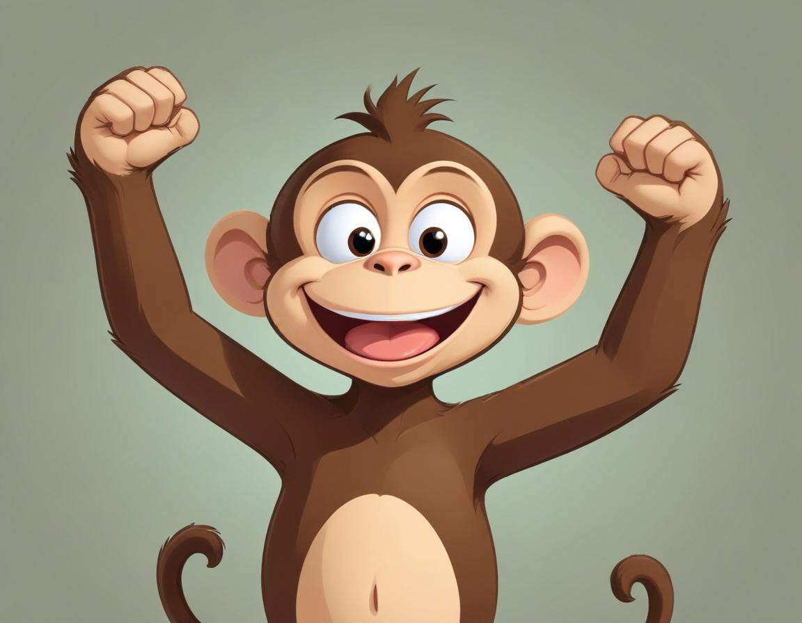A joyful cartoon monkey with big eyes and a wide smile raises its arms in celebration, exuding happiness and playfulness against a soft background.