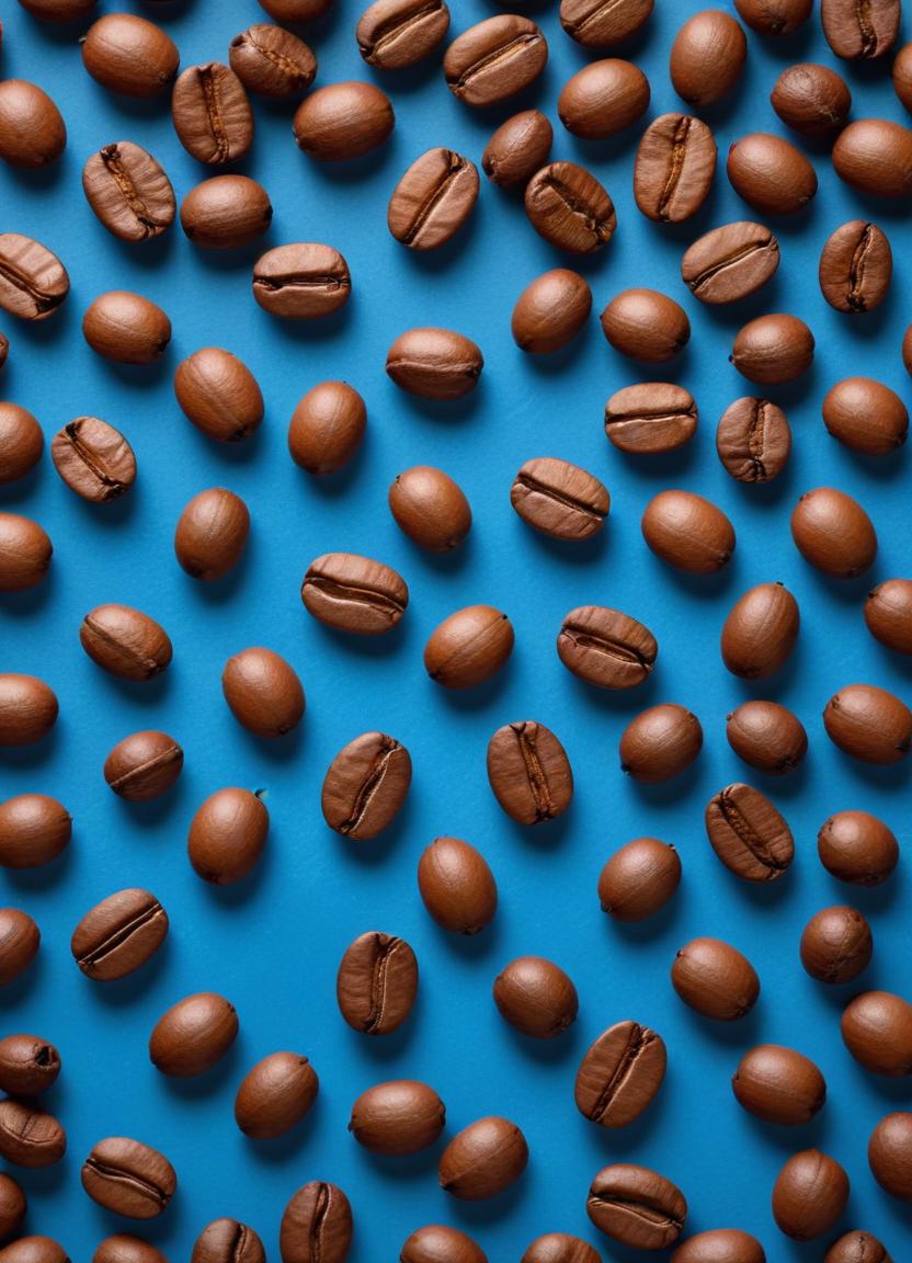 Roasted coffee beans are scattered across a bright blue surface, highlighting their rich color and texture. The arrangement creates a lively visual.