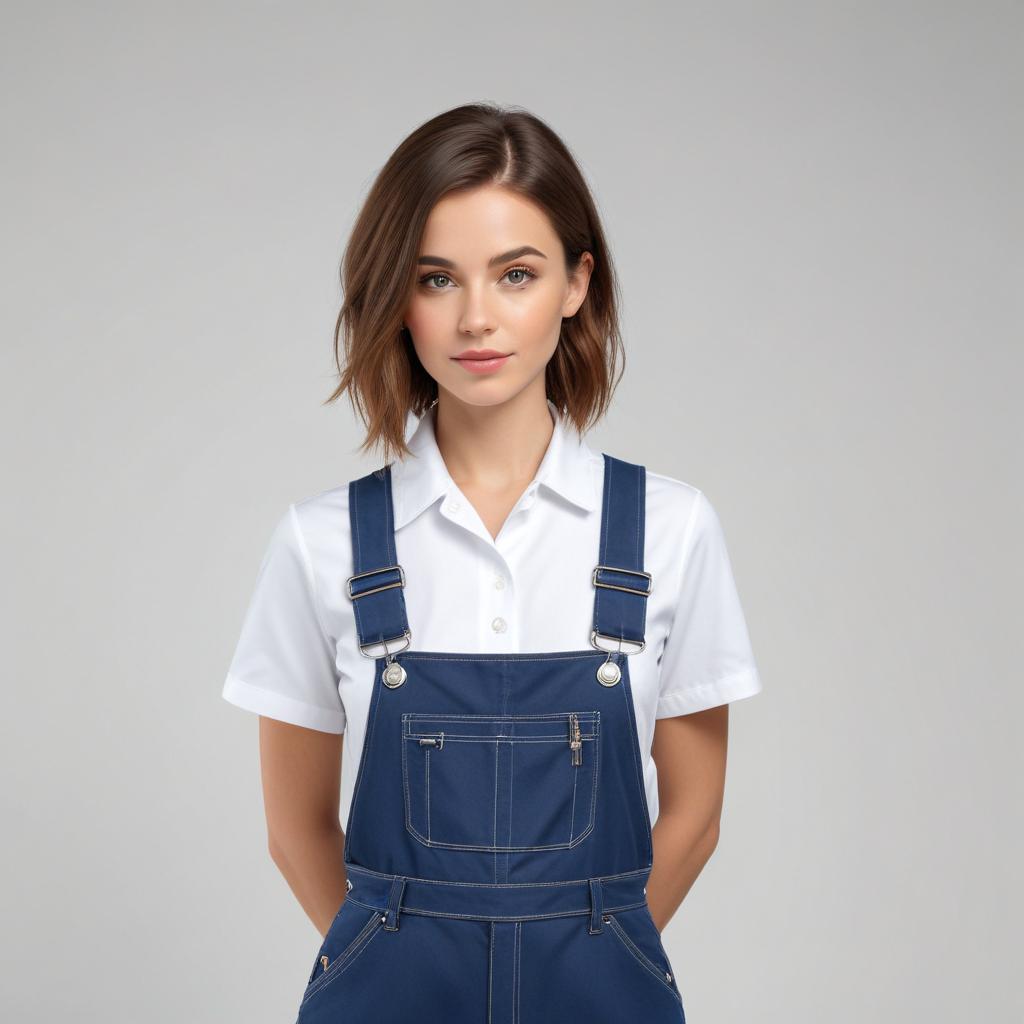 A young woman stands confidently, wearing a white shirt paired with blue overalls. She displays a calm expression against a neutral background.