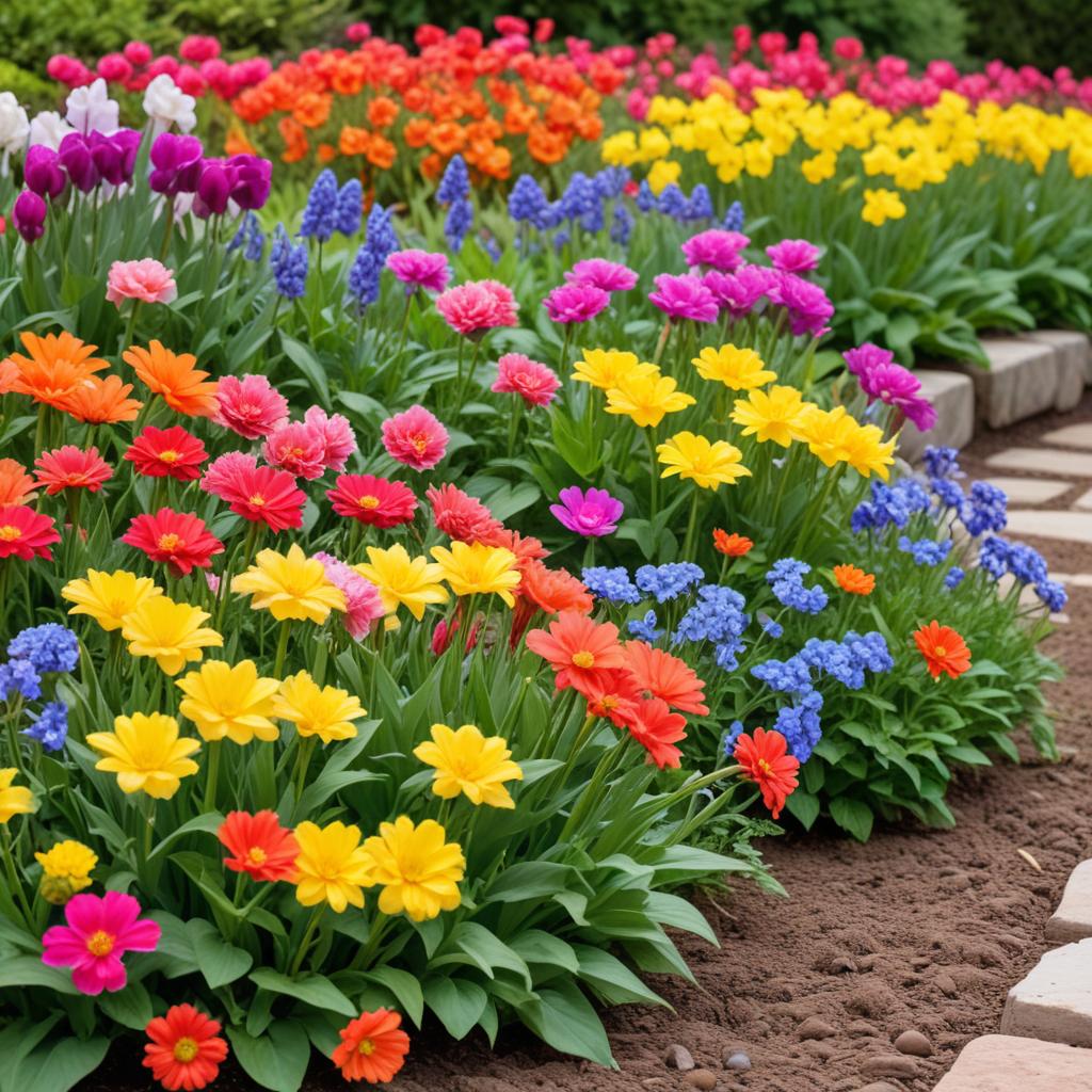 A vibrant garden filled with blooming flowers in various colors. Springtime brings lively beauty to this well-maintained landscape.