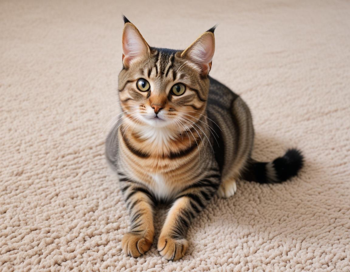 A striped cat rests calmly on a soft carpet, showcasing its vivid fur colors and attentive expression in a cozy indoor setting.