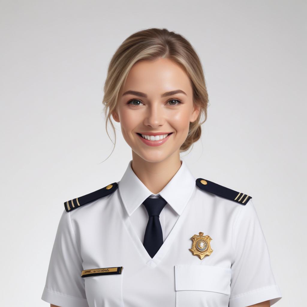 A young female officer smiles confidently while wearing her uniform, showcasing her badge. The background is simple and bright.