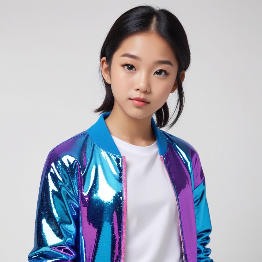A girl poses confidently, wearing a shiny blue and purple jacket. Her expression is calm, highlighting her fashion sense and style.