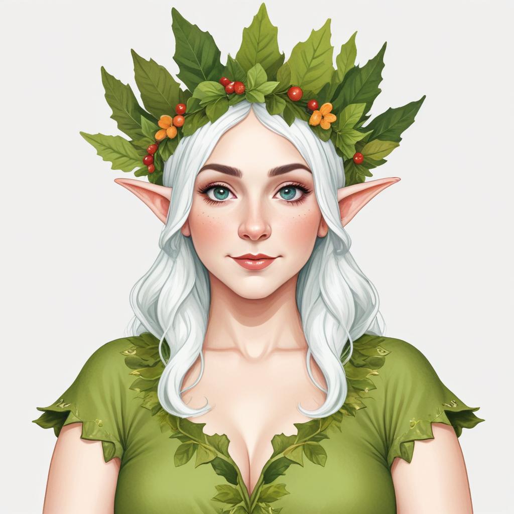 A mystical forest spirit adorned with a crown of leaves and flowers. Her white hair softly frames her serene face, surrounded by nature's beauty.