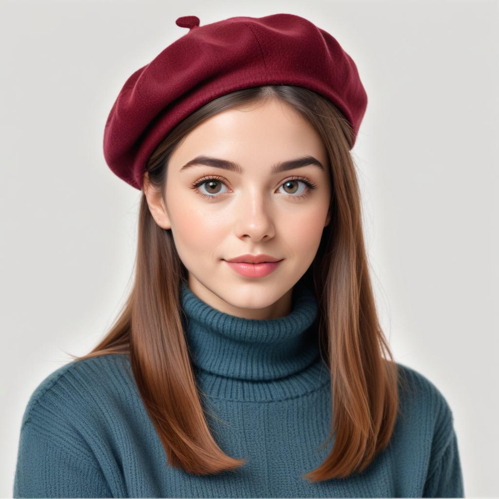 A young woman wears a burgundy beret and a cozy blue sweater, looking confidently at the camera. Her smooth hair complements her chic style.