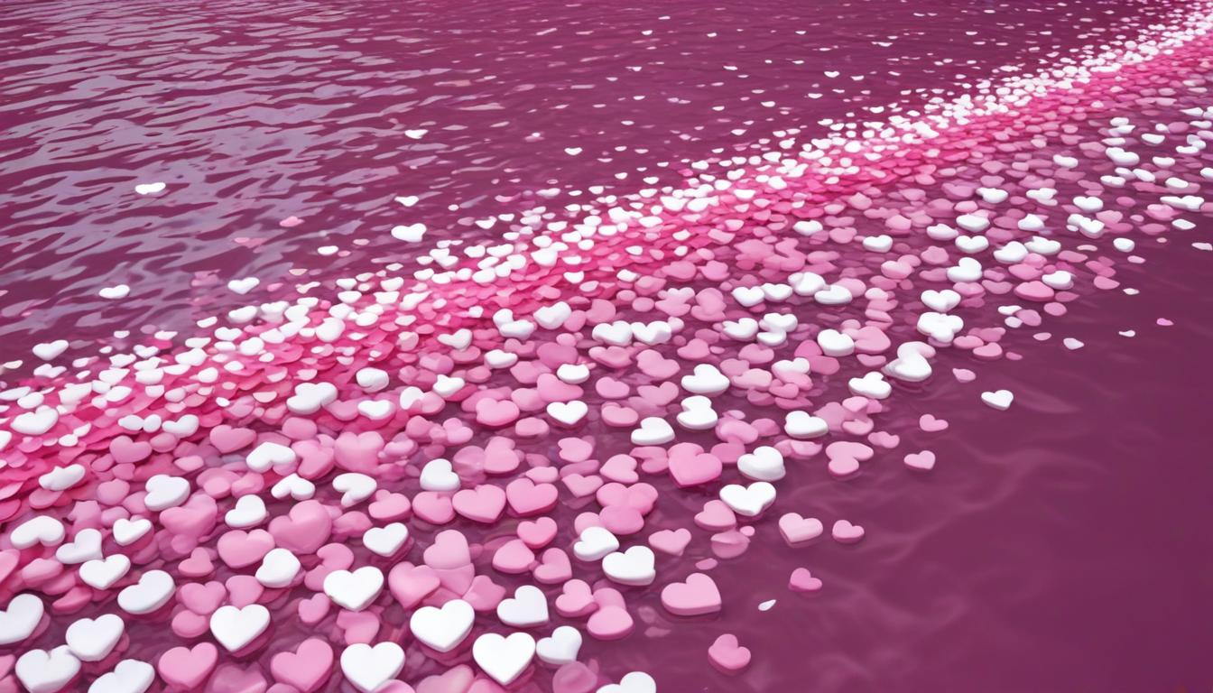 A vibrant scene of pink and white hearts drifting on the calm surface of water, creating a beautiful and romantic atmosphere.