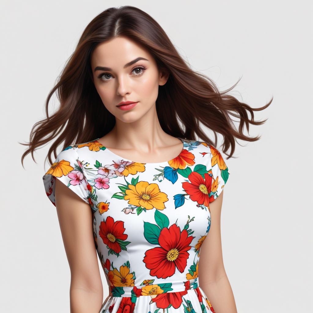 A young model showcases a colorful floral dress with vibrant patterns, highlighting her graceful hairstyle and natural expression.