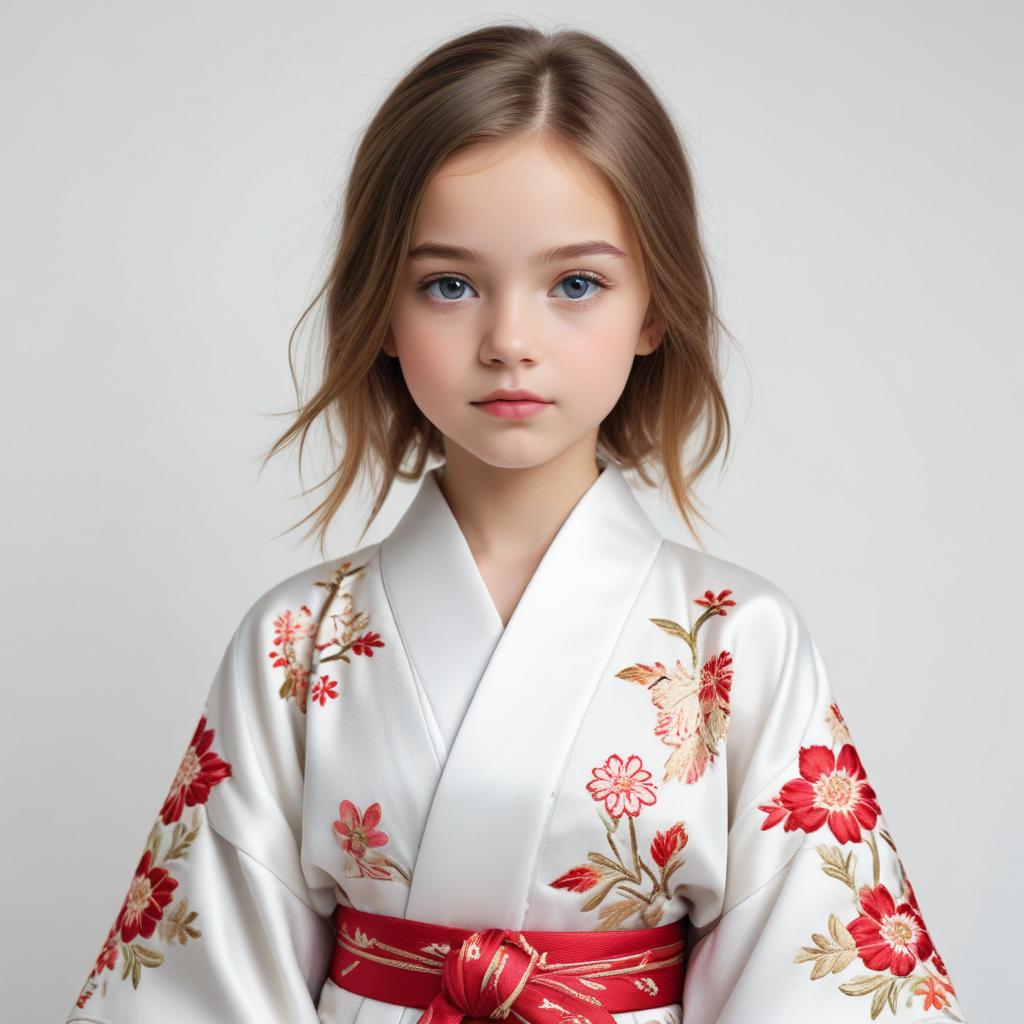 A young girl wears a beautifully embroidered kimono with red flowers, showcasing traditional Japanese attire. Soft lighting highlights her features.