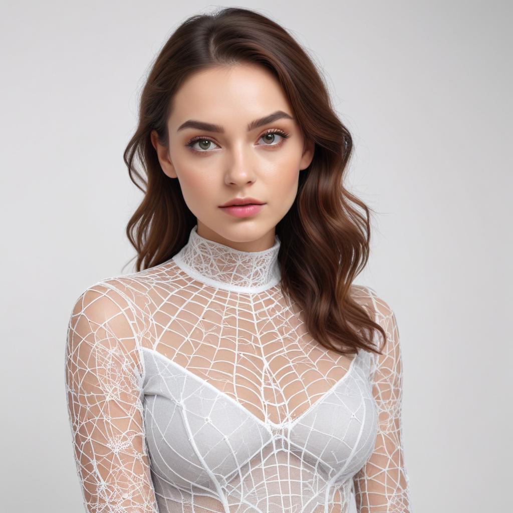 A young woman poses confidently in a sheer, lace outfit featuring intricate spiderweb patterns. Her hairstyle and makeup enhance her modern look.