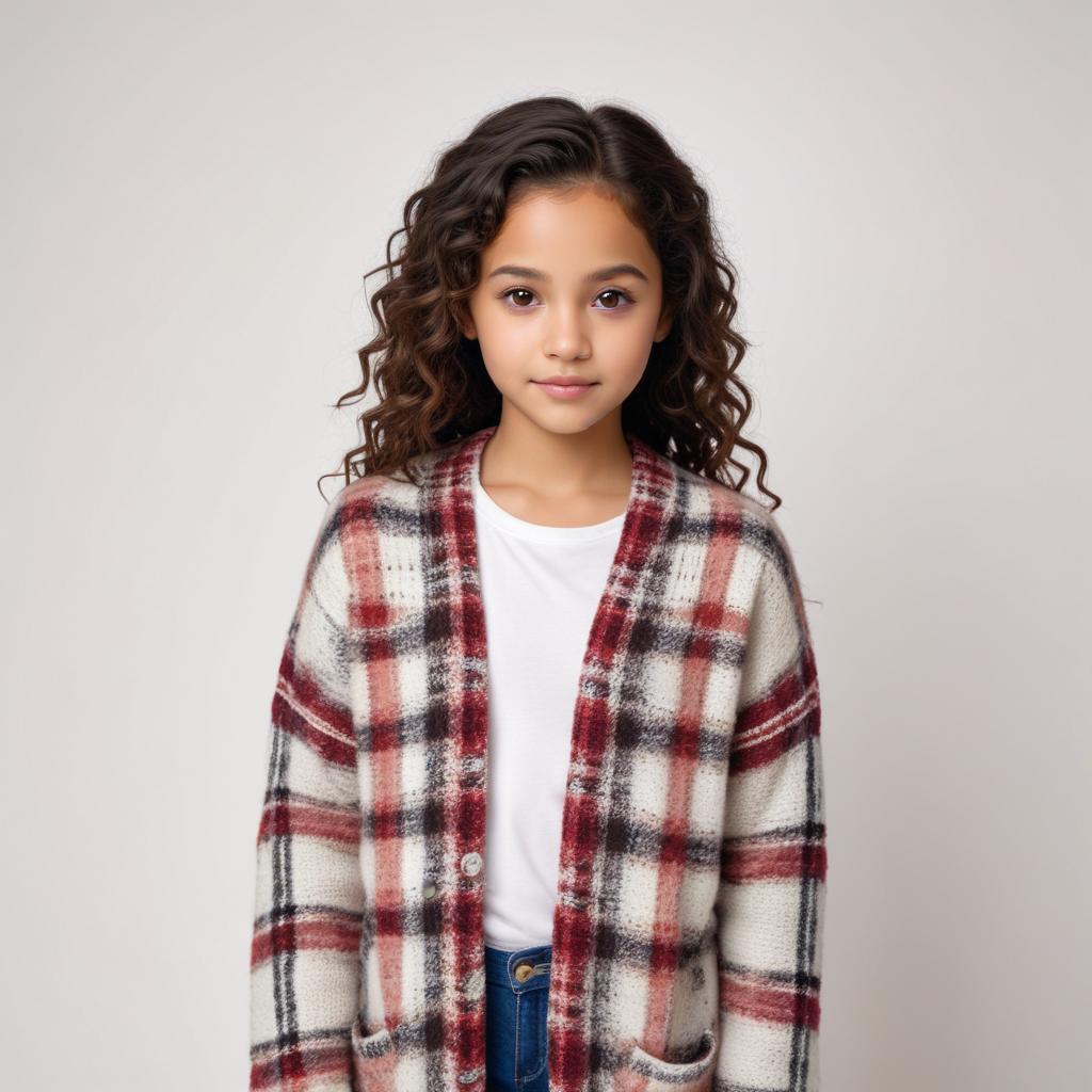 A girl with curly hair stands confidently wearing a warm, plaid cardigan over a white shirt, showcasing a simple yet stylish look.