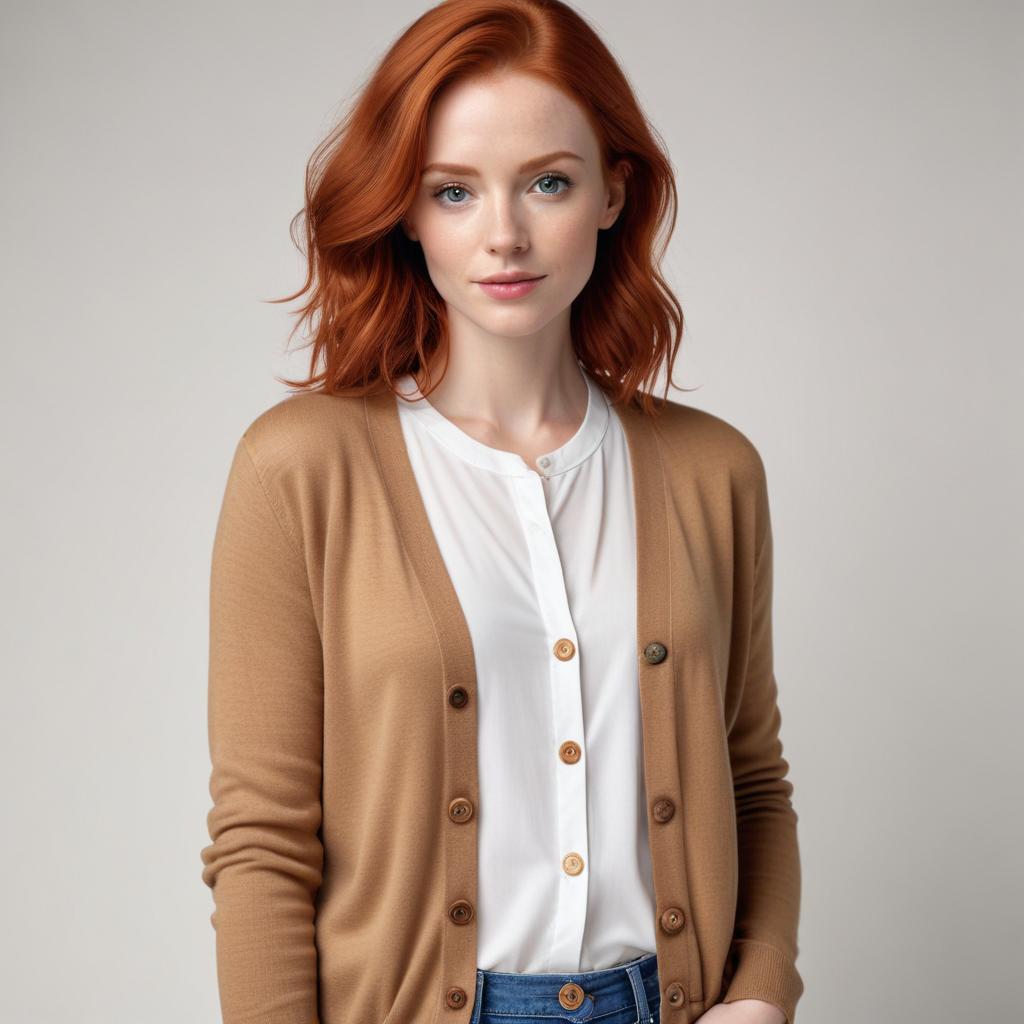 A woman with red hair stands confidently wearing a brown cardigan over a white top. She displays a relaxed yet stylish look.