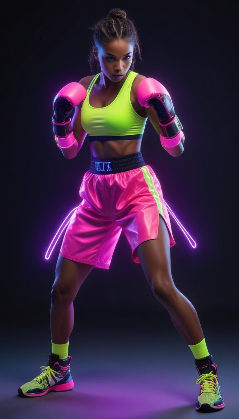 action pose, athletic wear, boxing, boxing gloves, competition, confident, determination, energy, female athlete, fitness, girl power, motion, neon colors, powerful, sport, strength, studio lighting, stylish, training, workout