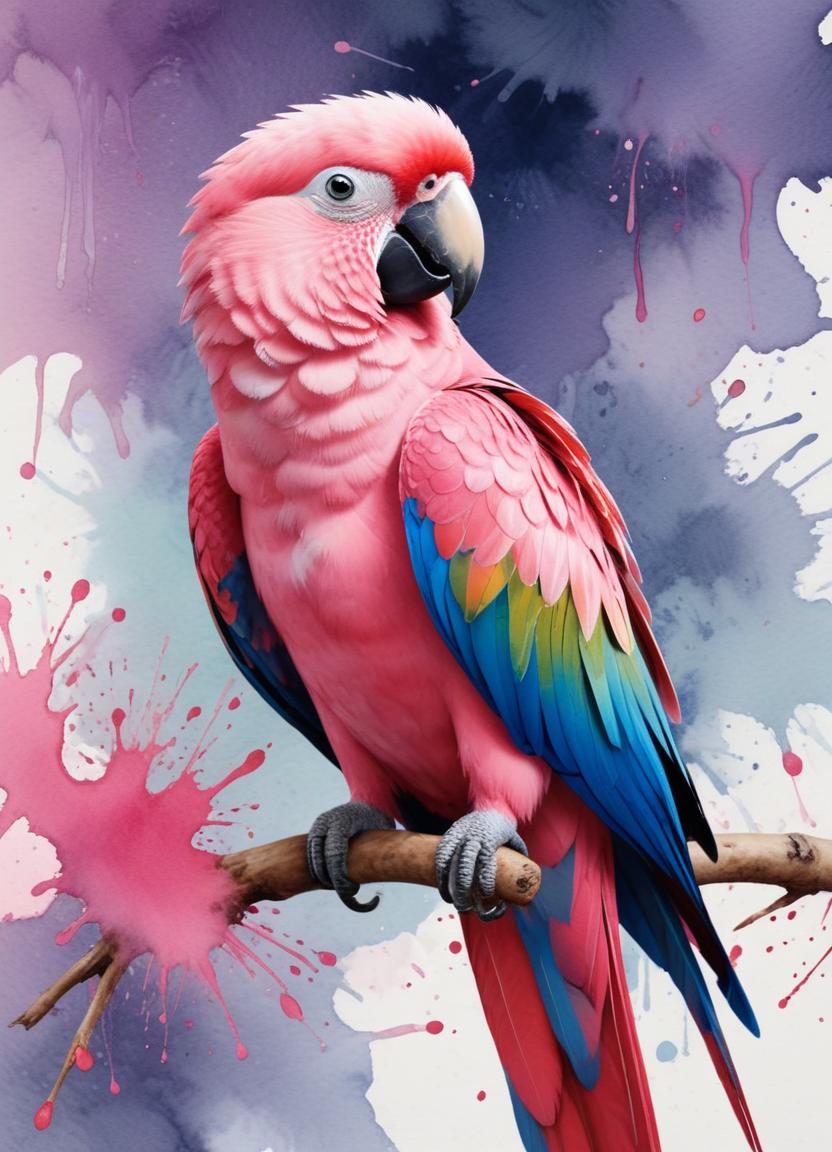 A vibrant pink parrot sits on a branch, showcasing its colorful feathers against a backdrop of abstract colors and paint splashes.