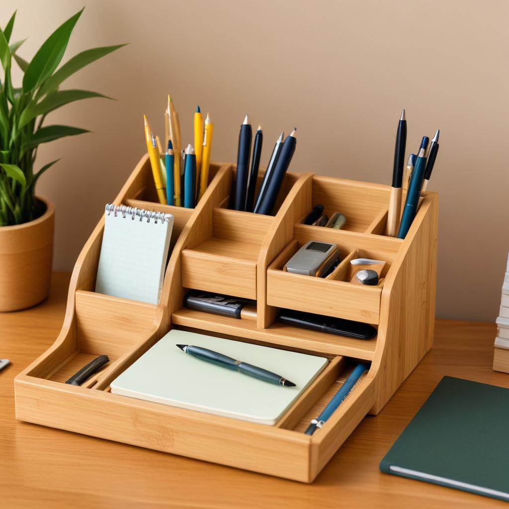 A tidy workspace features a bamboo stationery organizer filled with pens, pencils, and notepads. A plant adds a fresh touch to the space.