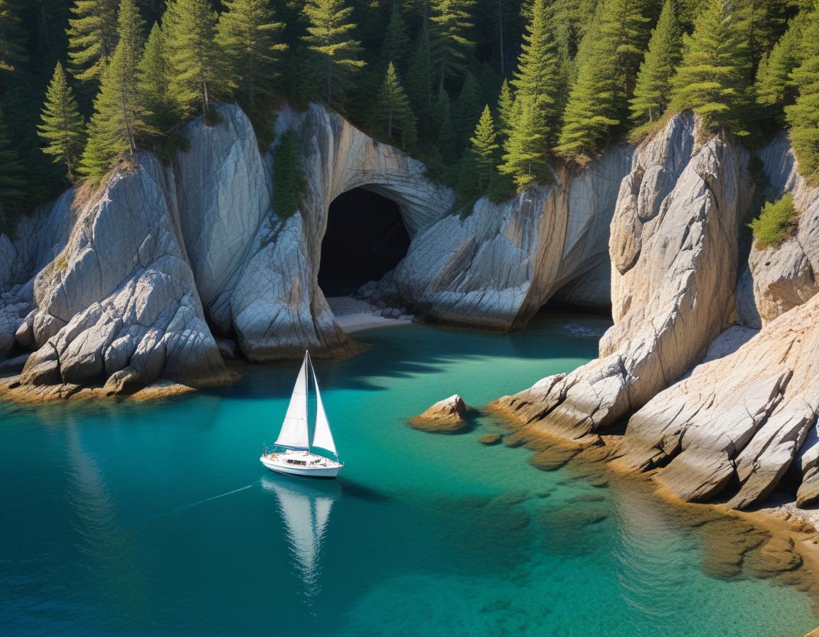 A sailboat glides over clear turquoise waters in a peaceful cove surrounded by tall trees and rocky cliffs, capturing the serene beauty of nature.
