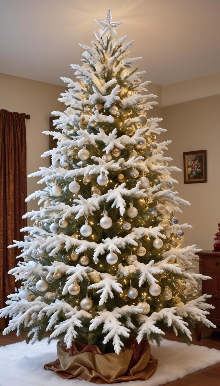 cheerful vibes, christmas tree, cozy room, elegant design, evergreen tree, family gathering, festive atmosphere, festive spirit, holiday decoration, holiday spirit, home interior, indoor setting, ornaments, seasonal celebration, sparkling lights, unique design, warmth, white ornaments, winter decor, winter holiday