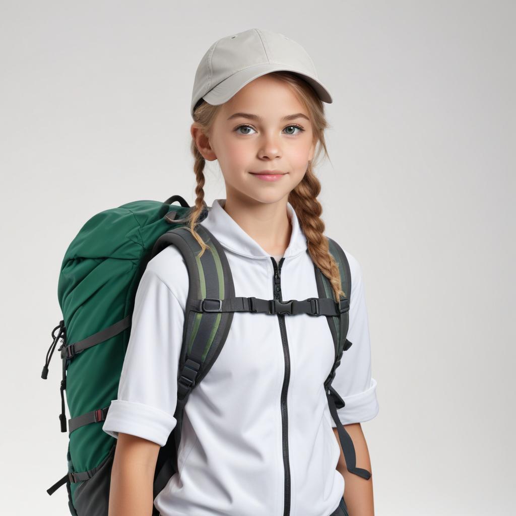 A child with a backpack is ready for hiking. She wears a cap and jacket, showcasing her excitement for outdoor activities.
