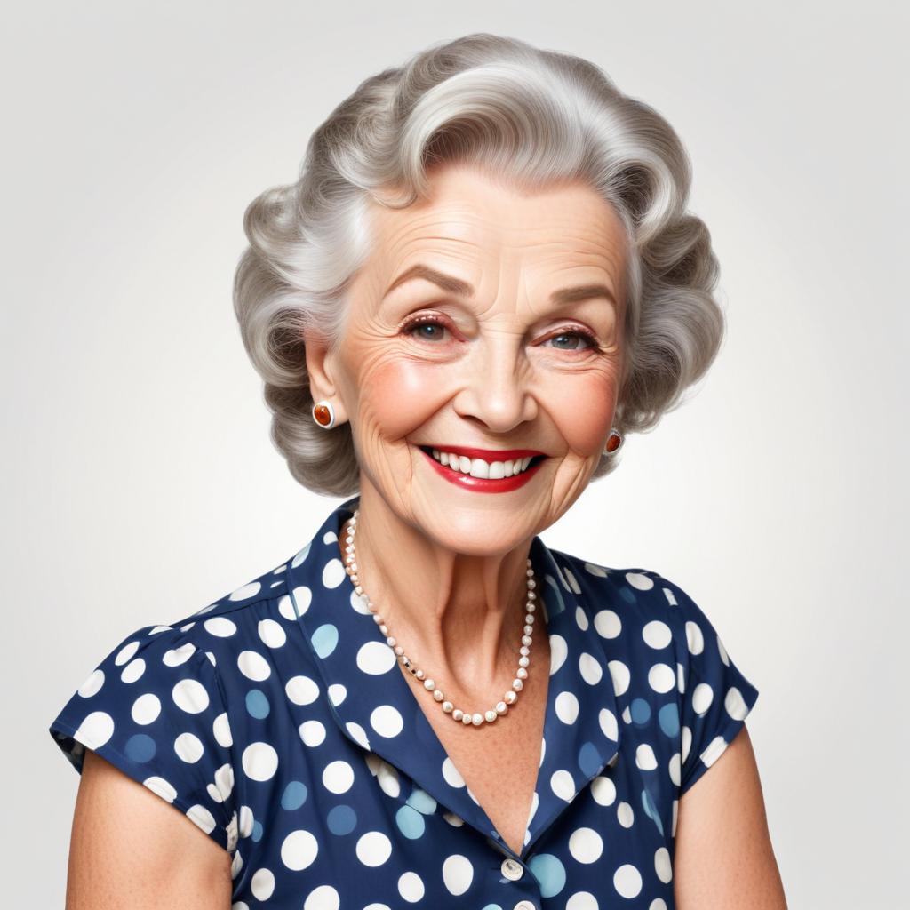 A cheerful elderly woman in a polka dot dress and pearls poses with a classic hairstyle, radiating warmth and positivity.
