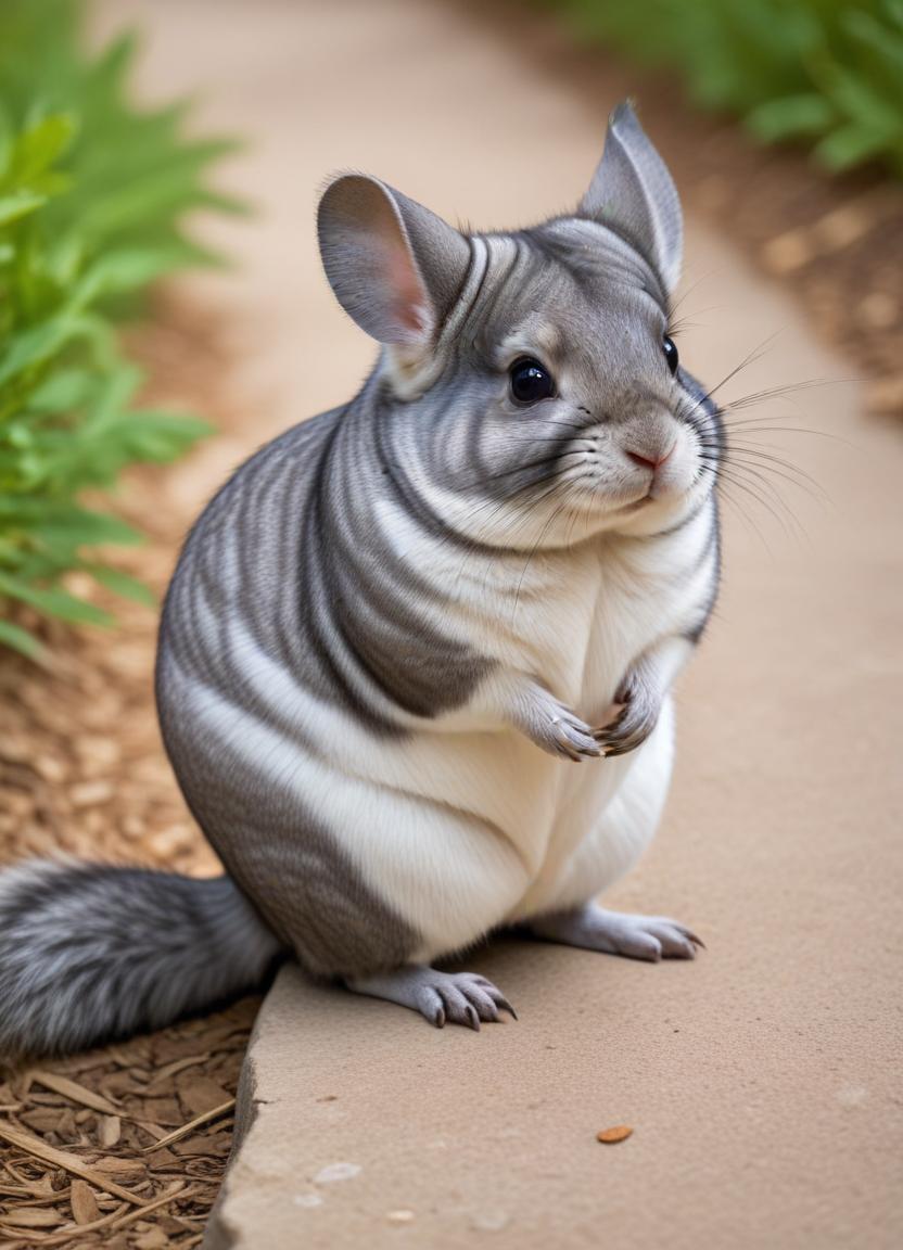 A small chinchilla stands on a path surrounded by green plants, enjoying a sunny day in a vibrant garden setting.