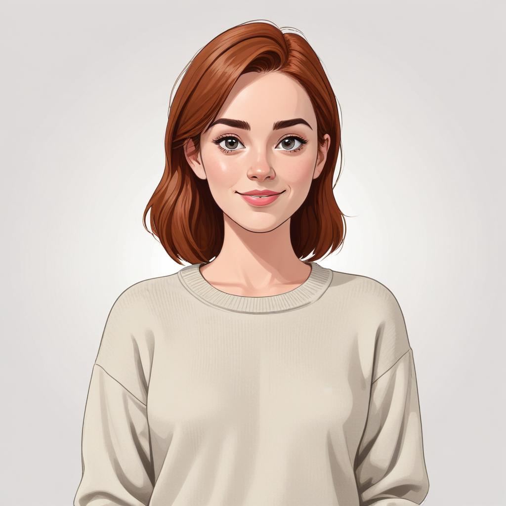 attractive, attractive features, casual, character design, digital art, engagement, expression, friendly, light background, modern style, neutral colors, portrait, relaxed, simple attire, smiling, sweater, warmth, woman, young adult, youth