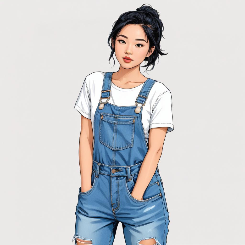 casual style, clean background, confidence, denim fashion, denim overalls, everyday wear, fashion, feminine, hairstyle, modern style, portrait, pose, relaxed atmosphere, simplicity, street style, stylish, summer look, trendy outfit, young woman, youth