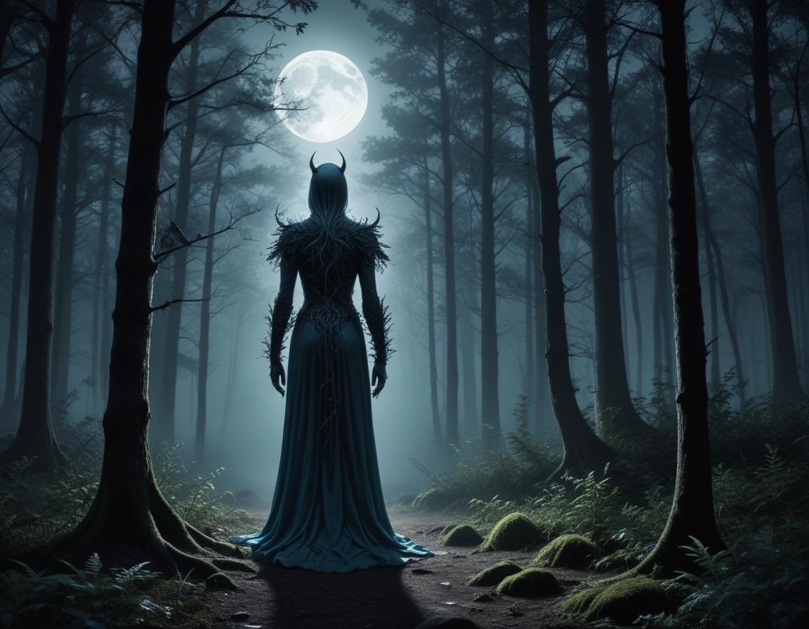 In a mystical forest, a cloaked figure stands under a full moon, surrounded by towering trees and eerie shadows, creating an enchanting atmosphere.