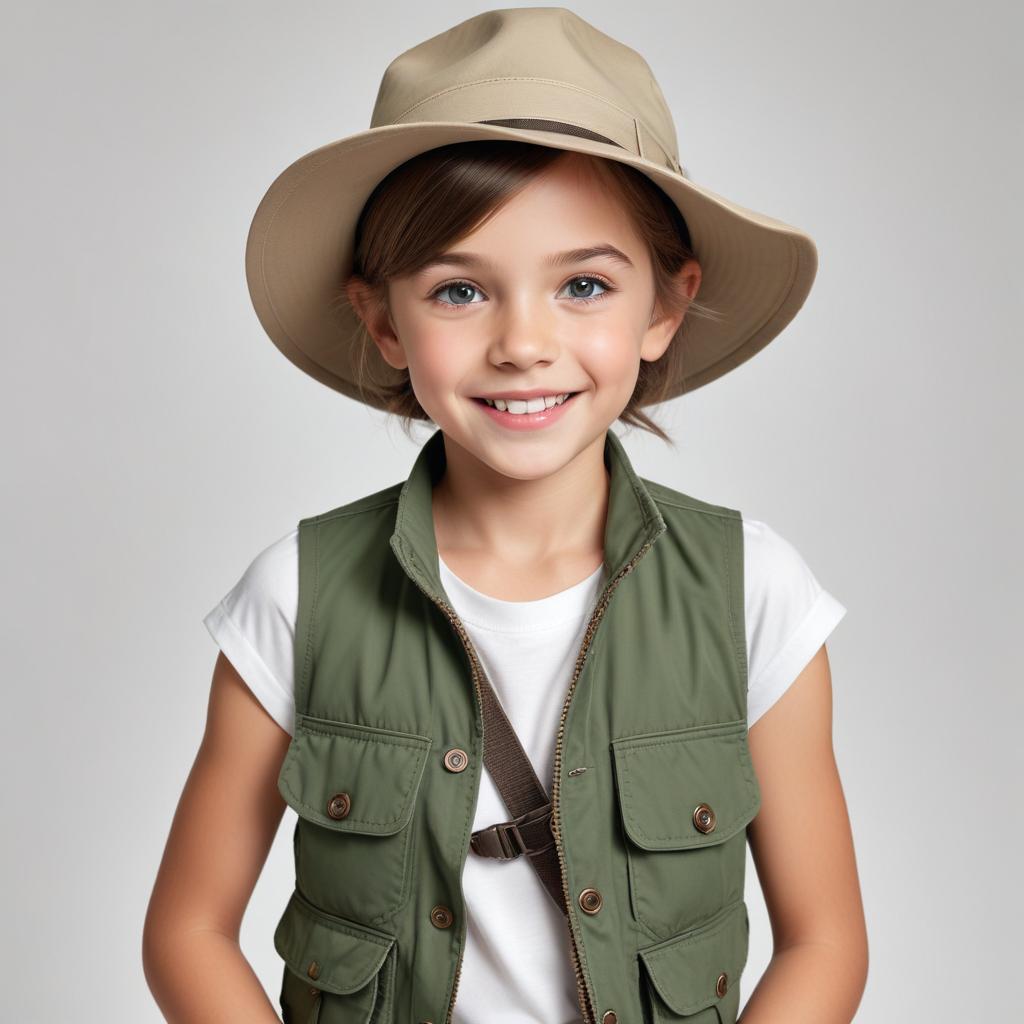 A girl smiles confidently, dressed in a green vest and beige hat, prepared for an adventurous day outdoors.