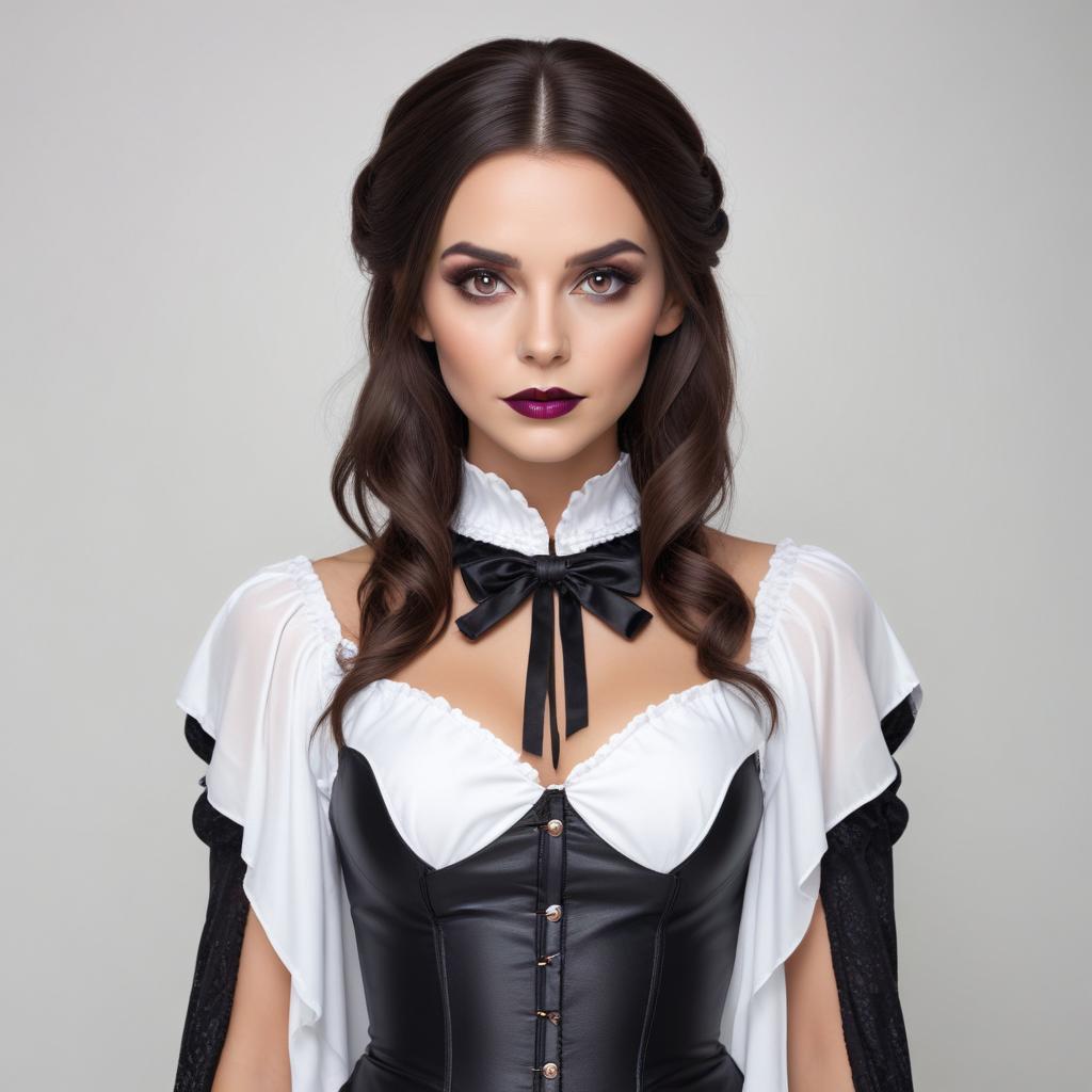 Woman dressed in a stylish vampire costume poses for Halloween. Dark lipstick and a dramatic cape complete the spooky look, ready for celebration.