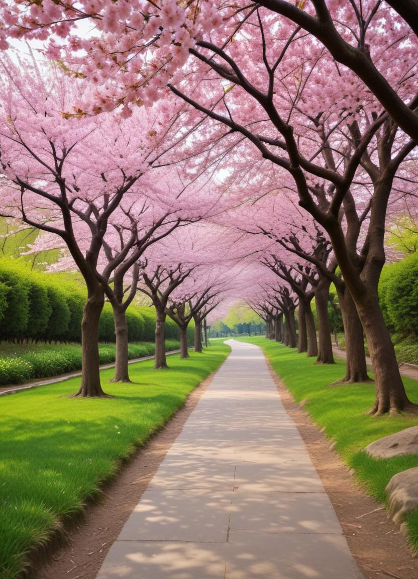 Soft pink cherry blossoms line a walking path, creating a serene atmosphere. Green grass adds to the beauty of this spring scene.