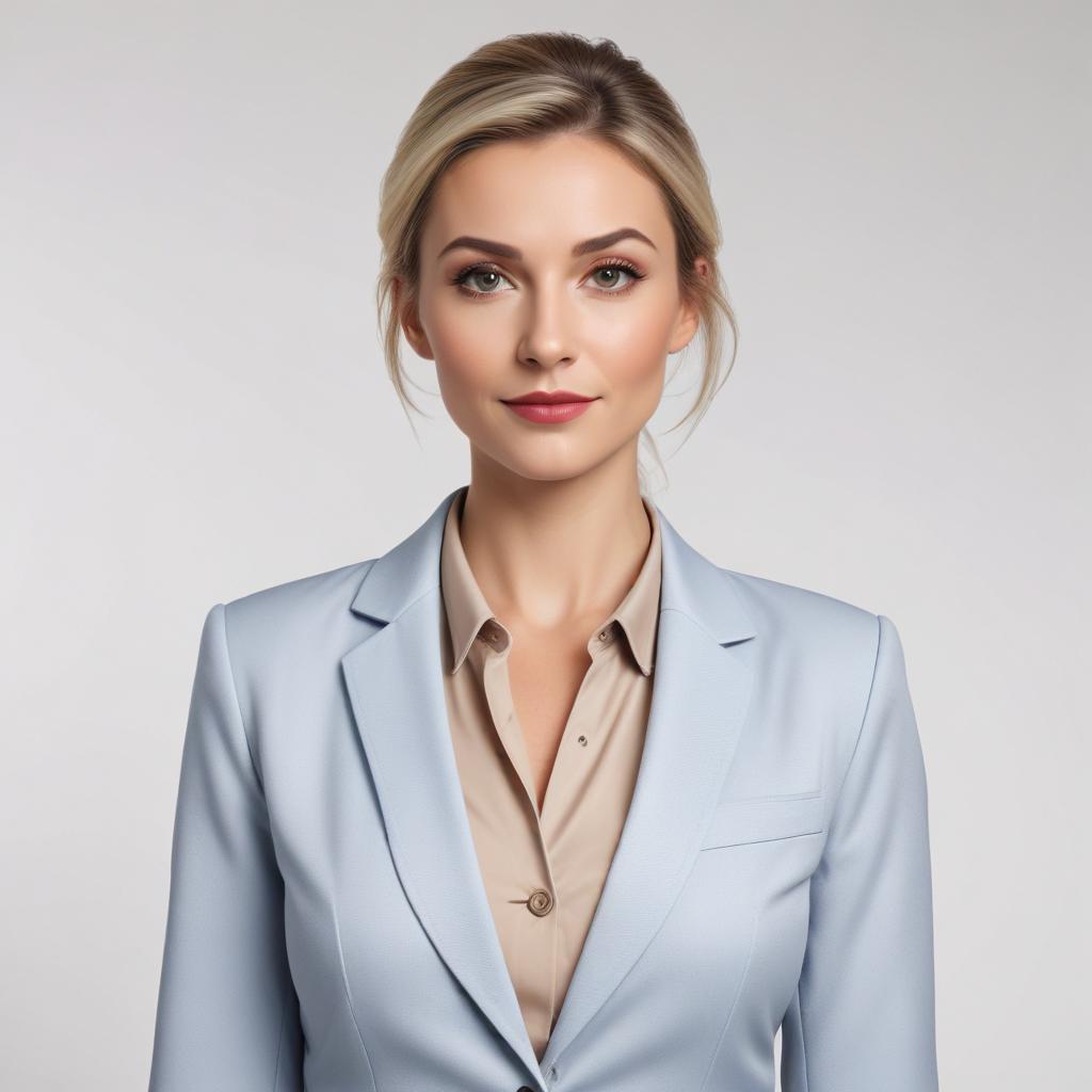 A professional woman stands confidently, wearing a light blue blazer over a beige blouse. Her makeup is elegant, and her expression is poised.