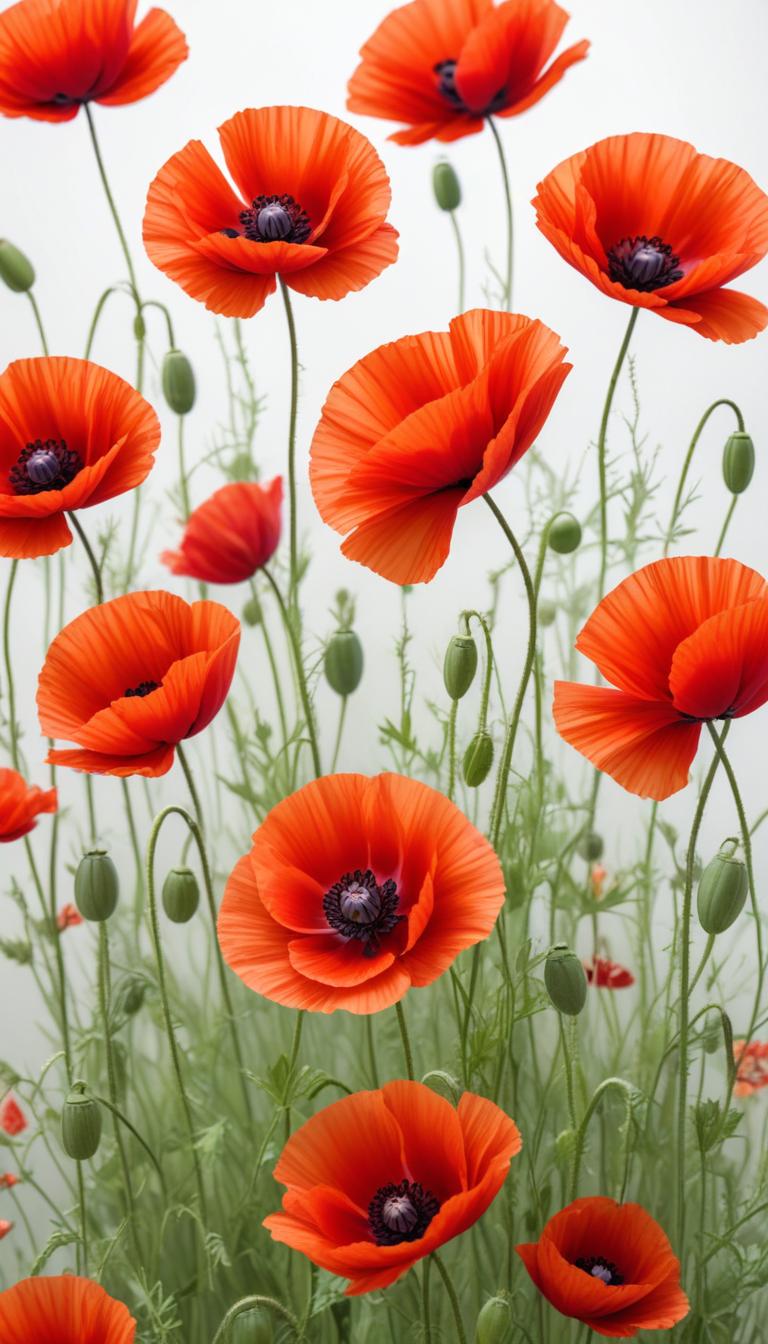 Bright red poppies stand tall in a field, showcasing their delicate petals and green stems. The scene is vibrant and peaceful.