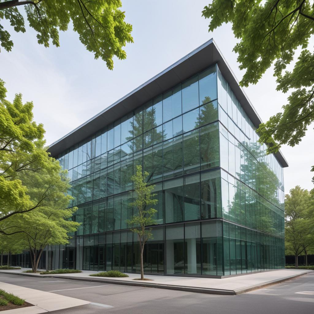 A sleek glass building stands amid green trees, showcasing modern architecture.