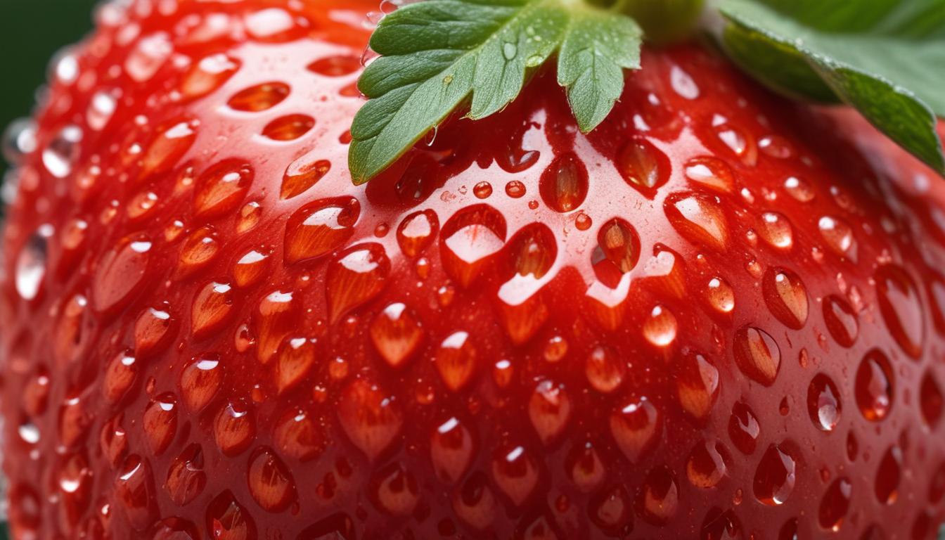 A close-up view of a ripe strawberry covered in water droplets, highlighting its vibrant red color and fresh appearance.