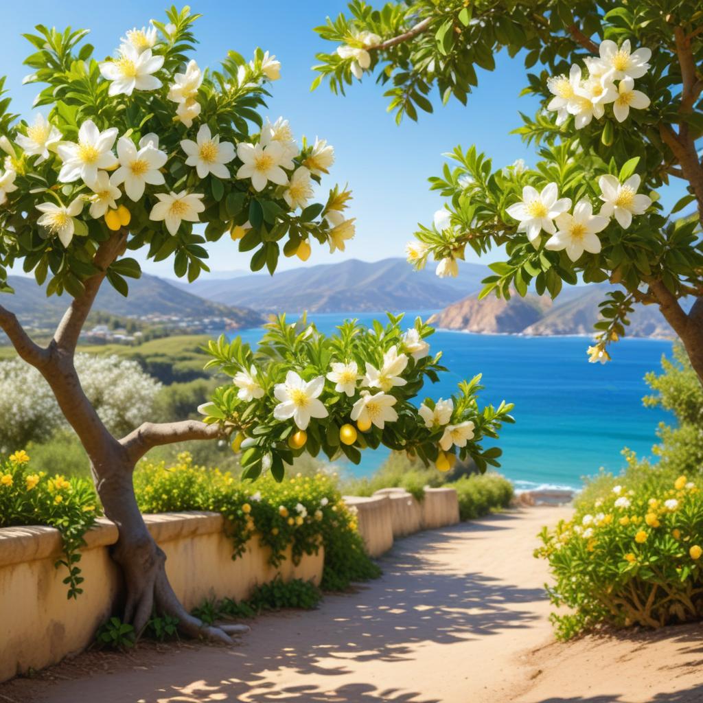 A serene coastal path lined with vibrant flowering trees. The sun shines brightly over the calm blue sea and distant hills.