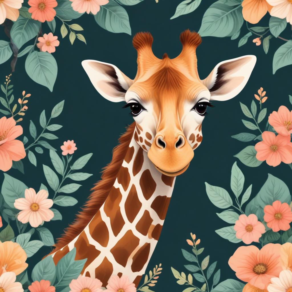 animal art, animal portrait, character, cheerful, colors, cute, exotic, floral design, flowers, giraffe, greenery, illustration, jungle, natural beauty, nature, patterned background, portrait, safari, serene, wildlife