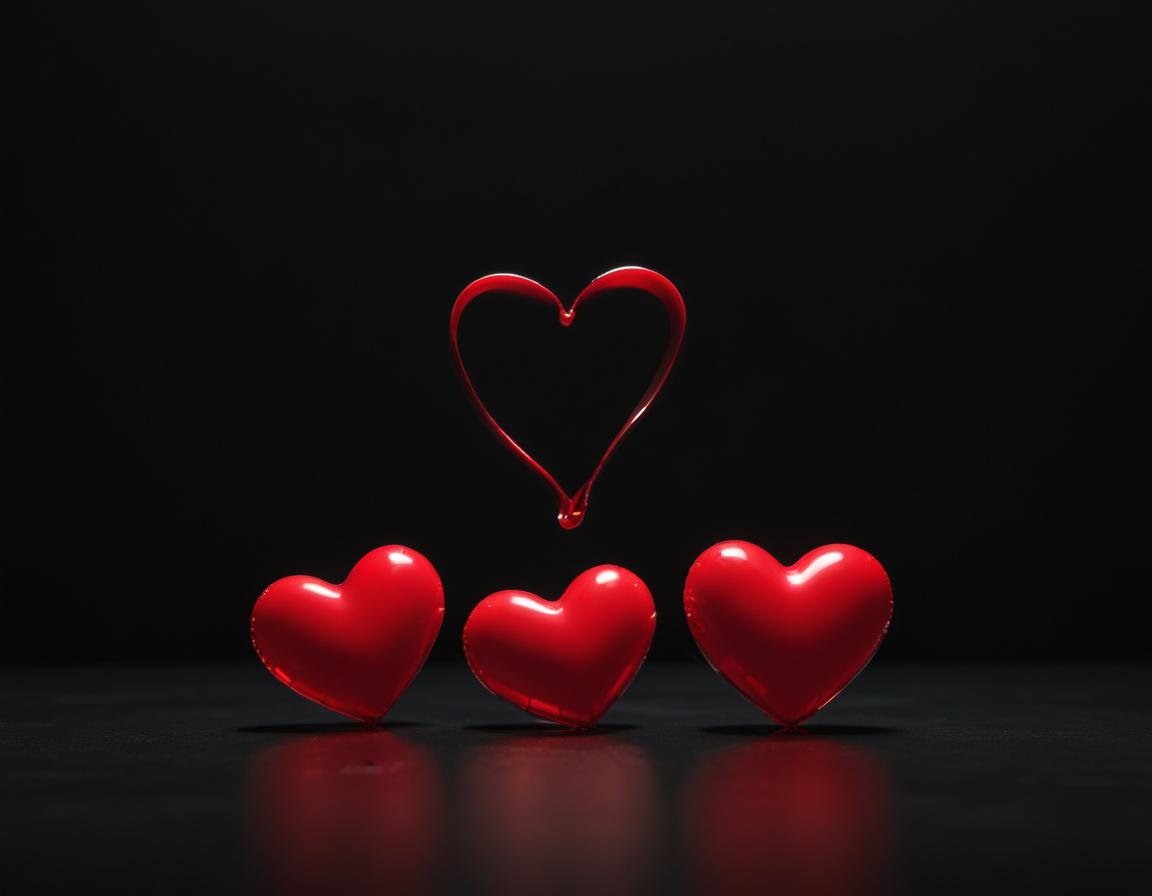 Three red hearts sit in a dark space, with one heart dripping above them. The scene evokes feelings of love and warmth.