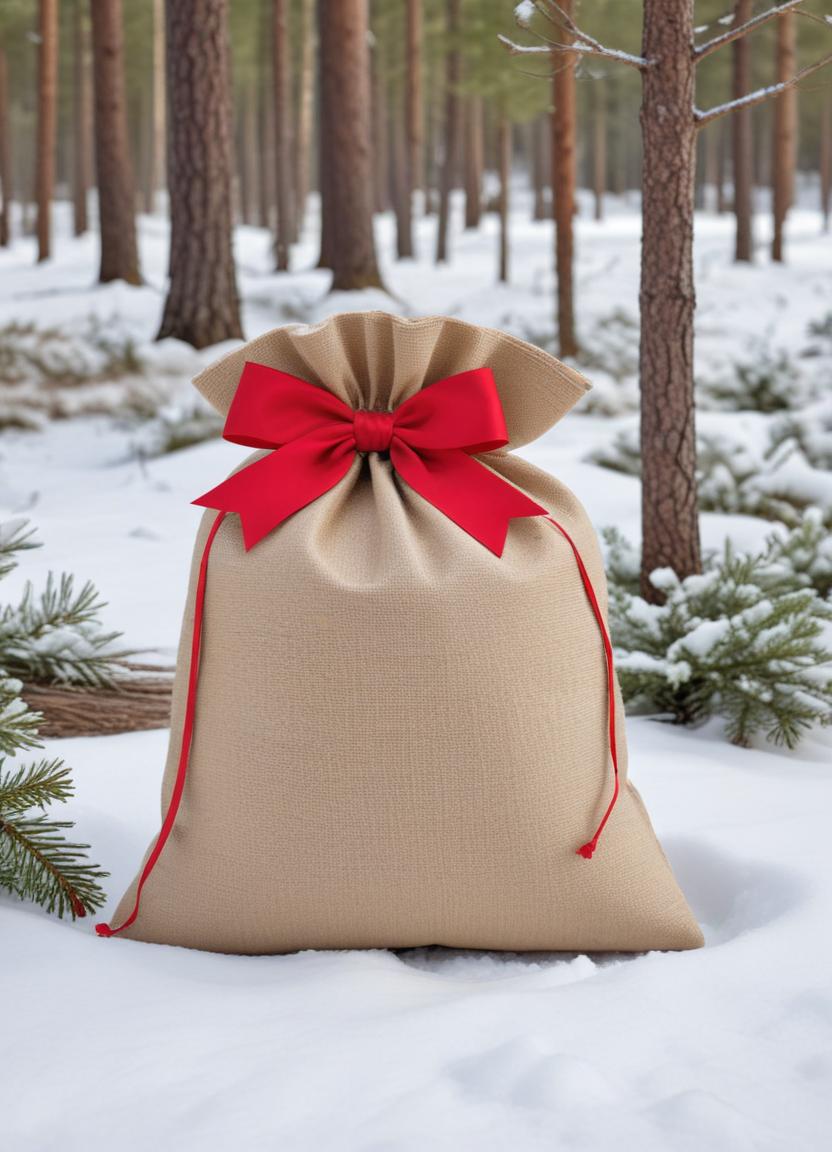 A large gift bag with a red bow rests on the snow-covered ground in a serene forest during winter, surrounded by pine trees.
