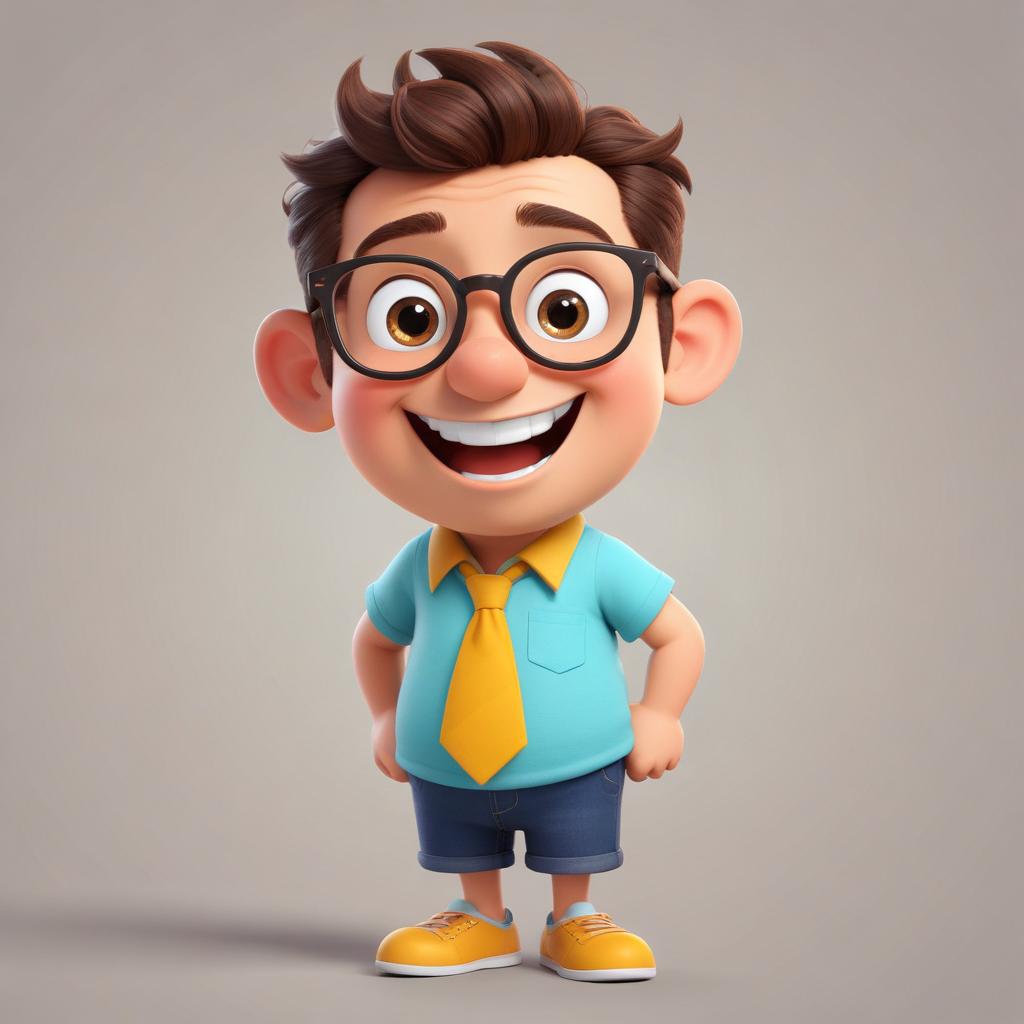 A cheerful cartoon boy stands confidently, wearing a light blue shirt, yellow tie, and shorts, with a big smile and glasses.