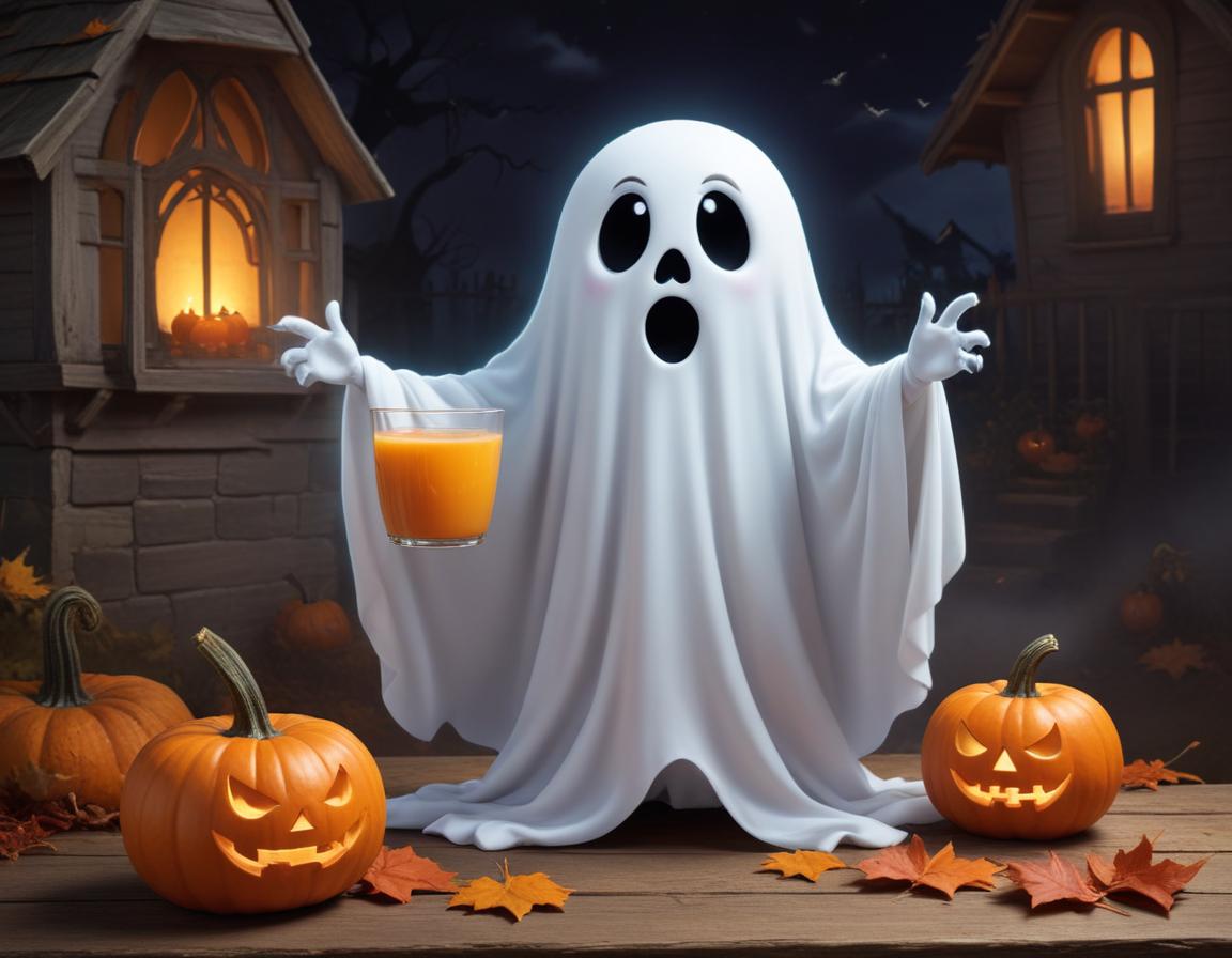 A friendly ghost holds a drink while surrounded by carved pumpkins and autumn leaves in a festive Halloween atmosphere at night.