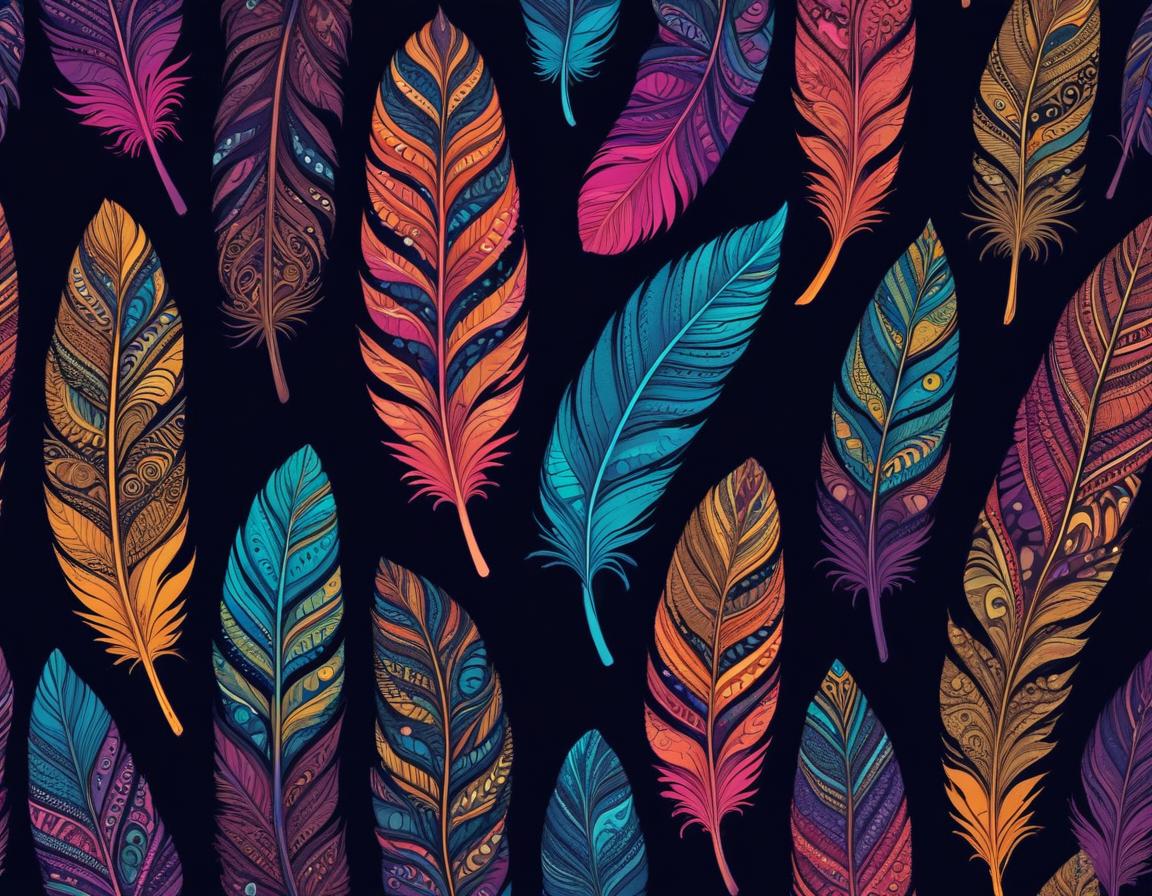 abstract, bohemian style, colorful artwork, craft, creativity, dark background, decorative art, detailed illustration, fabric design, feathers, modern design, natural elements, nature, ornamental, patterns, stylized art, symmetry, texture, visual art, wallpaper