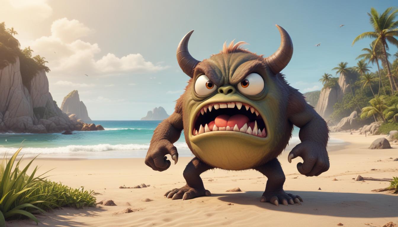 A furious cartoon monster stands on a sandy beach, surrounded by palm trees and the ocean. It looks ready to cause trouble.