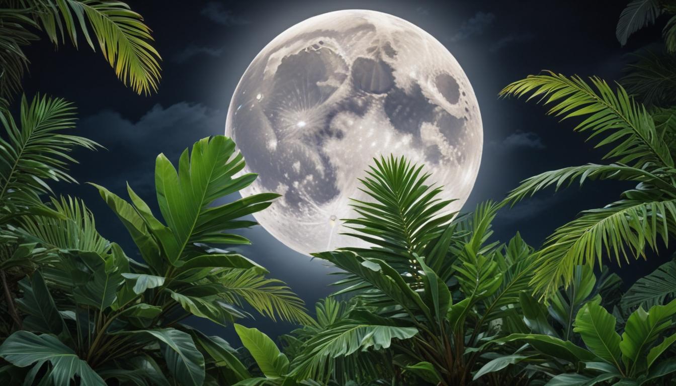 A luminous full moon shines brightly in a dark sky, surrounded by vivid green palm leaves. The scene evokes a serene nighttime atmosphere.